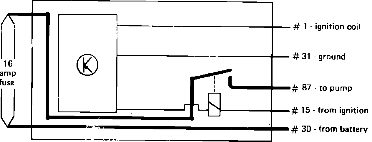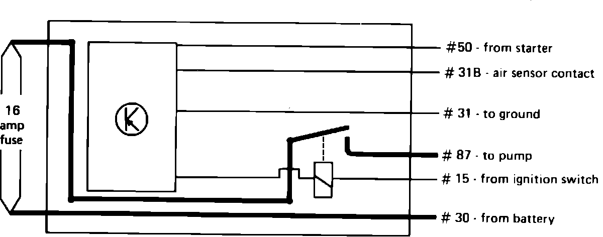 With ignition on, current is supplied to the pull-in coil which is grounded through the transistorized circuit whenever the starter is operating (50) or the air sensor contact (31B) is open during normal running. The pull-in coil completes the circuit between battery terminal 30 and the fuel pump via the 16 amp fuse on top of the pump relay, Fig. 16. To run pump with engine off for testing purposes, remove air sensor electrical connector with ignition on.