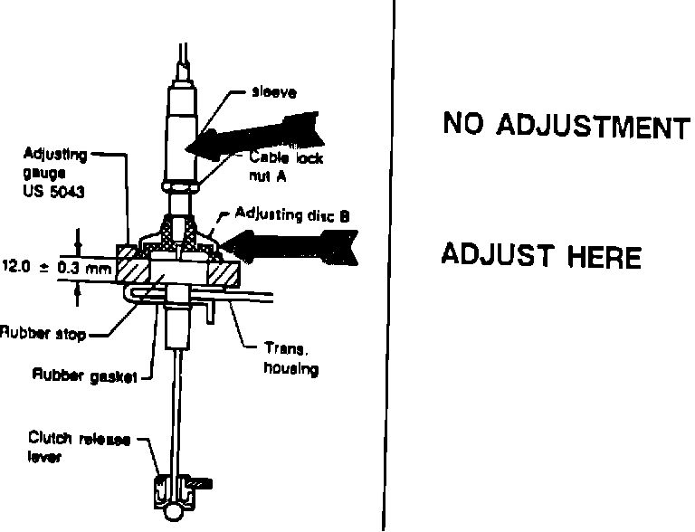Clutch freeplay adjustments must be made at the adjusting disc (B), not at the sleeve. Failure to do so will break sleeve.