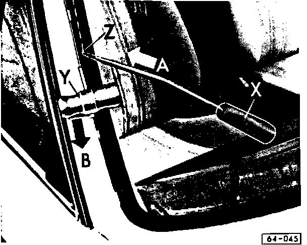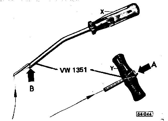 - attach ends of wire to tool VW 1351 (or use 2 needle nose vise grips) so part X is inside and part Y outside of car. Thread wire through in direction of arrows and secure ends at screws A and B