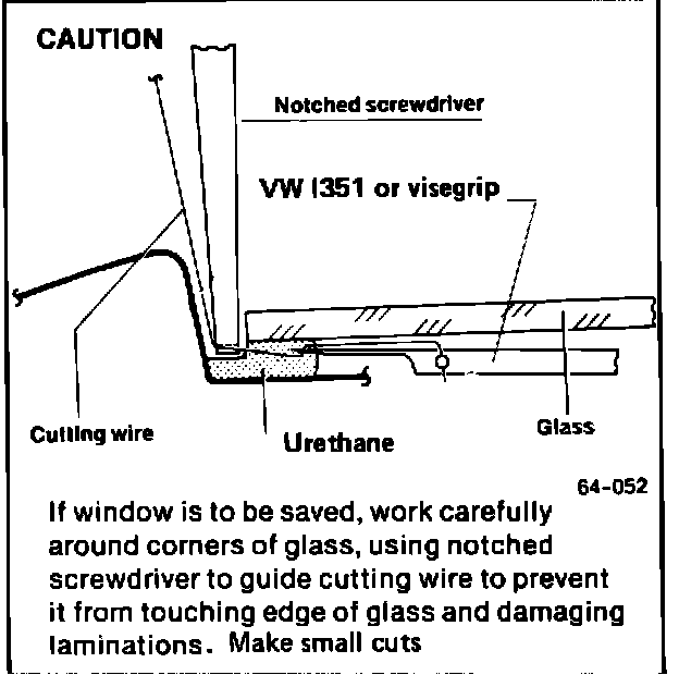When tool 1351 (or vise grip) is properly used, part X (inside vise grip) will act as an anchor point for cutting wire and handle Y (outside vise grip) will be used to pull wire down to anchor point so it knifes smoothly through urethane. Do not use sawing motion. Periodically reheat windshield with hot air gun in area to be cut, to ease cutting action