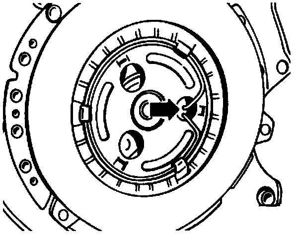 CAUTION: The two guide pins in the flywheel must align with the corresponding holes in the clutch pressure plate, or the pressure plate will be damaged during installation. Do not mistake balancing holes for guide pin holes.