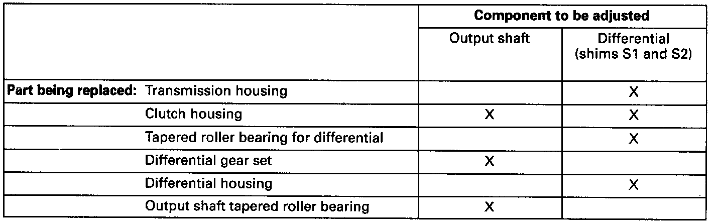 - When servicing the transmission, adjustment of the output shaft (pinion), final drive gear or gear set is necessary only if components that have a direct effect on the adjustment of the final drive unit are replaced. Refer to the table to avoid unnecessary adjustment