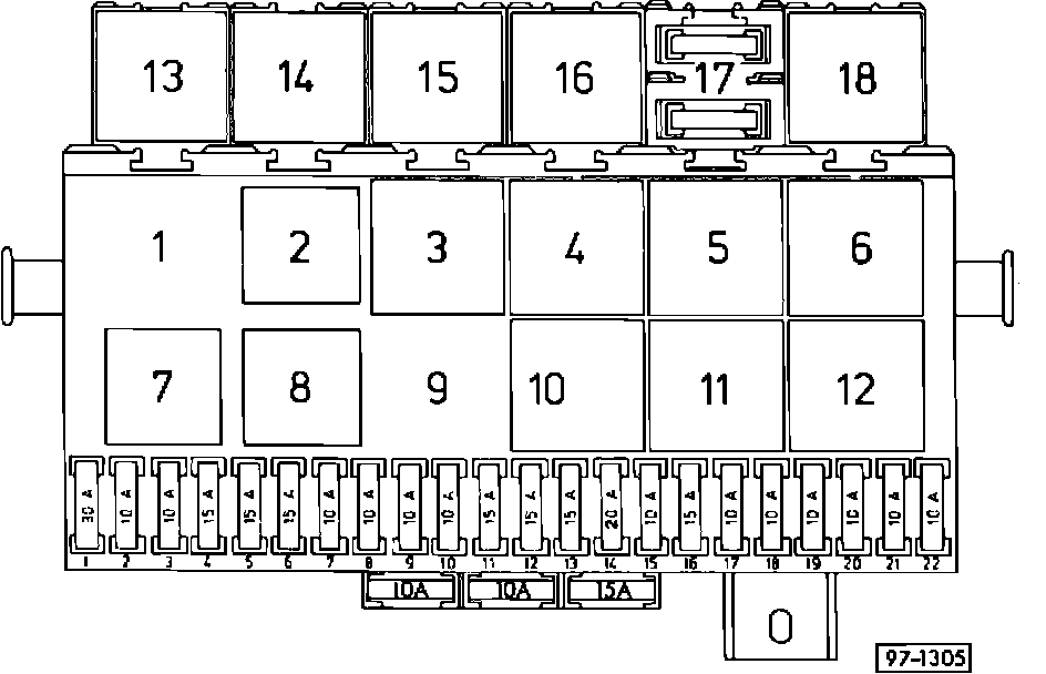 10 - windshield intermittent wiper 11 - rear wiper 12 - emergency flasher 13 - not used 14 - power windows 15 - OXS 16 - hot-start pulse 17 - for fuse adapter 18 - catalytic converter and coolant-level control