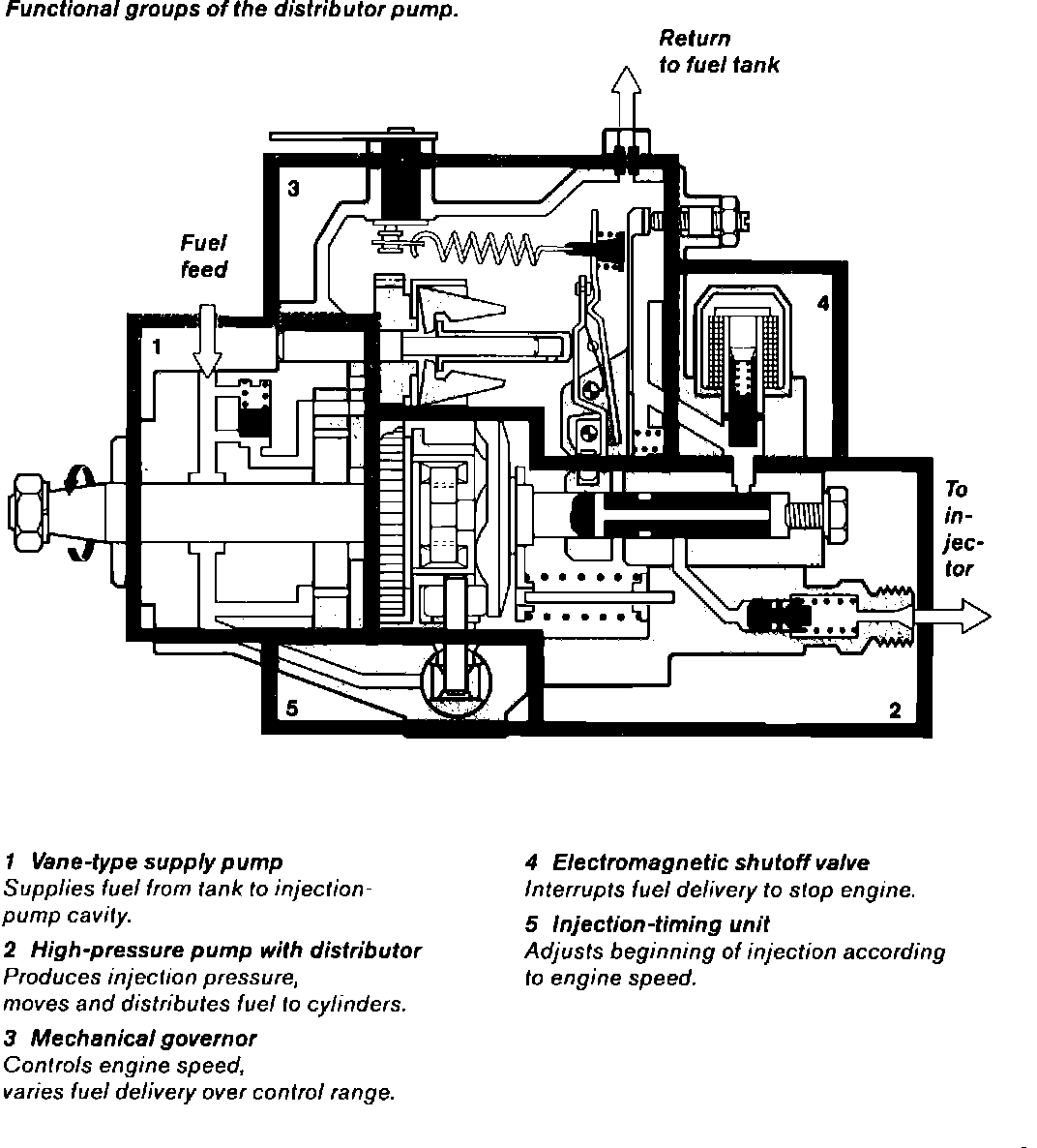 Fig. 1 shows these groups and their functions. The distributor pump can also be equipped with various supplementary functions to accommodate specific engine characteristics.
