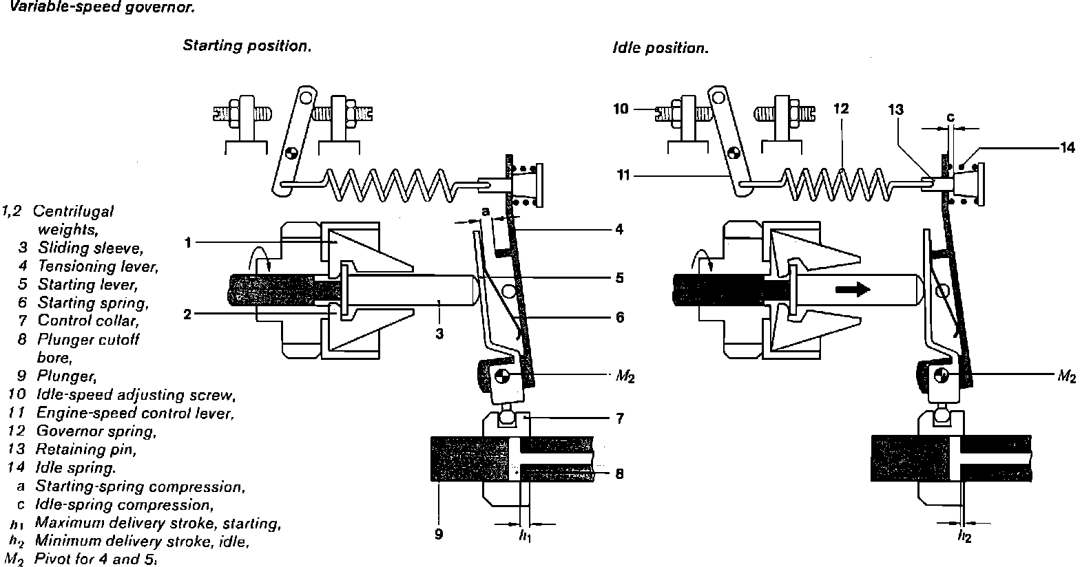 Control is by the idle spring on the retaining pin, which counteracts the force from the centrifugal weights. This balance of forces determines the sliding sleeve's position with reference to the plunger cutoff bore, and therefore the length of the delivery stroke. At engine speeds above idle, the spring is collapsed by the amount c, Fig 8, and therefore no longer effective.