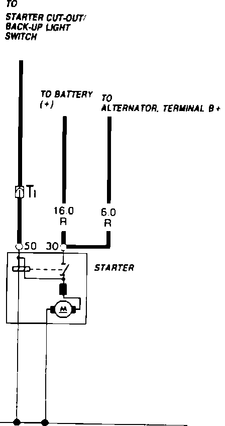 ^ insert new connector housing, Part No. 111 971 921 B, into connector T1 of starter cable harness leading to starter solenoid terminal 50