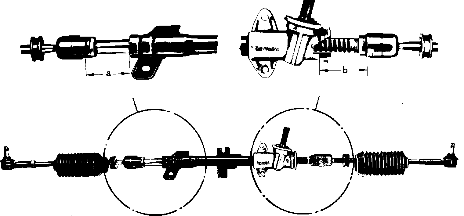 b. After the tie rods are connected, an adjustment is required. On automatic transaxle equipped vehicles, set dimension ``a'', Fig. 6 to 2.638 inches and dimension ``b'', Fig. 6, to 2.716 inches. On manual transaxle equipped vehicles, set dimensions ``a'' and ``b'' to 2.716 inches, Fig. 6.