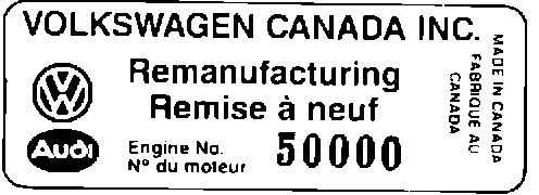 As of December 1983 production, all short blocks and engines remanufactured by VW Canada will be equipped with two self-adhesive labels. These labels will contain the following information:
