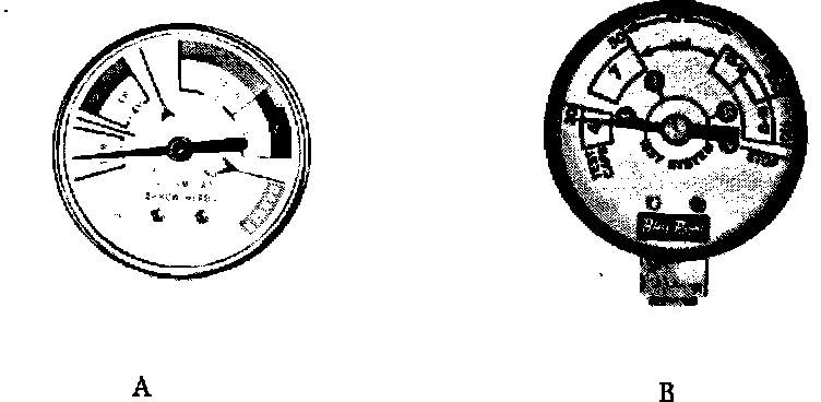 If your tester is equipped with a pressure gauge calibrated with colored bands (Illustration A) or with a pressure graph (Illustration B) these gauges must be replaced as they do not meet pressure requirements.