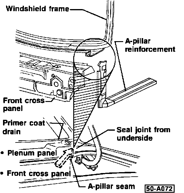 - seal joint under plenum panel where windshield frame, dash panel and A-pillar reinforcement come together (arrow)