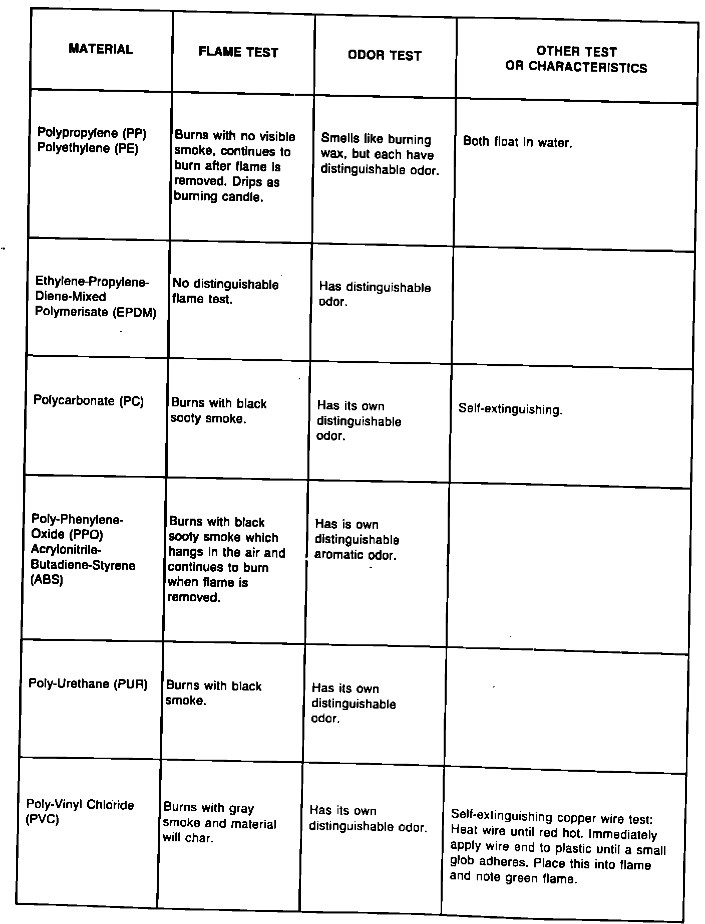 Once the category of plastic is determined, there are two tests, flame and odor which are used to determine the actual plastic material used.