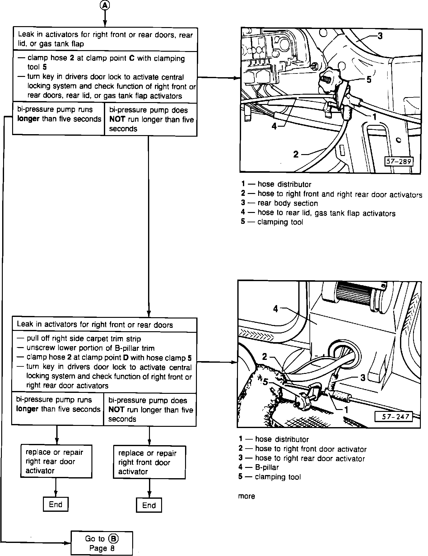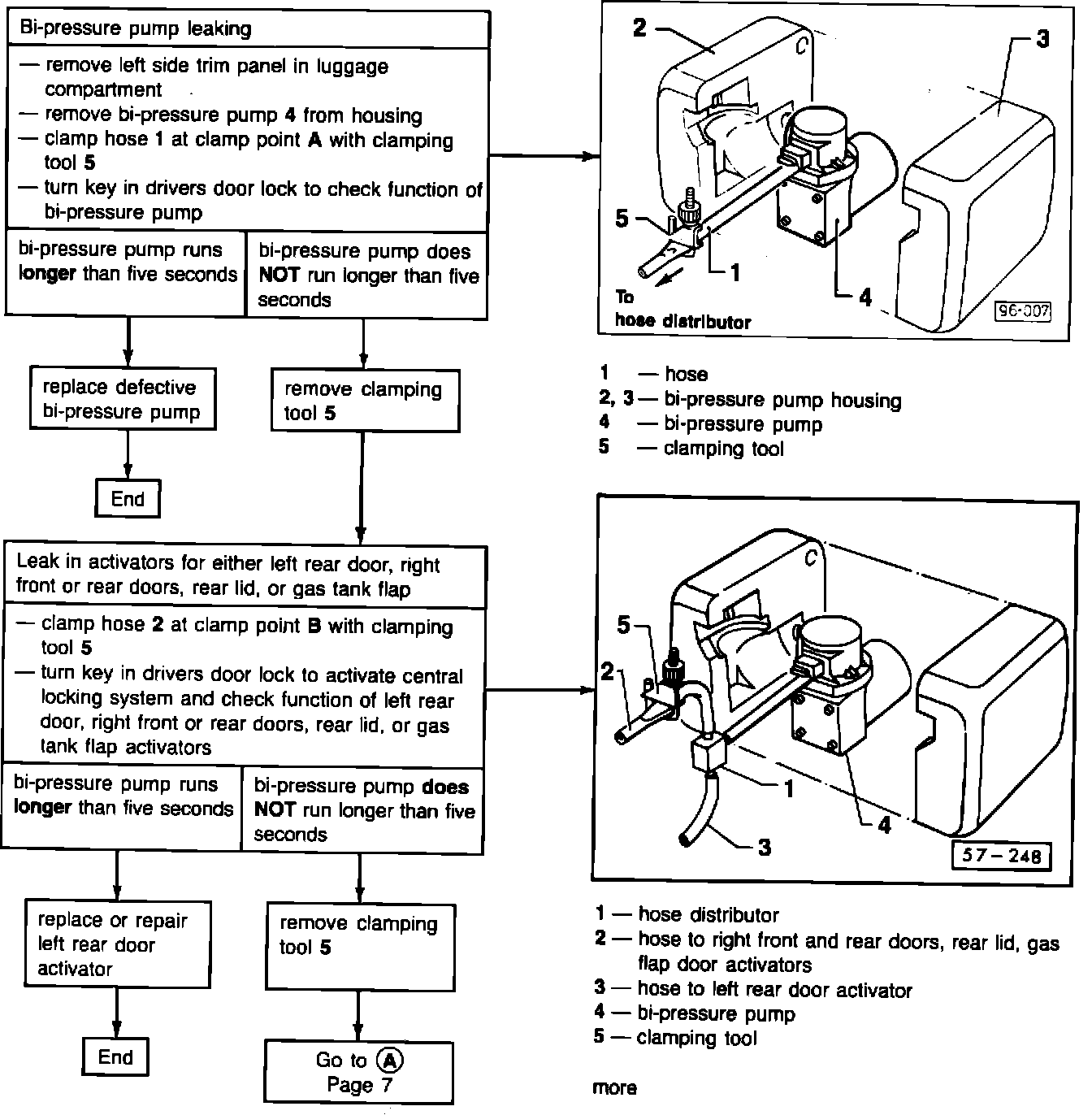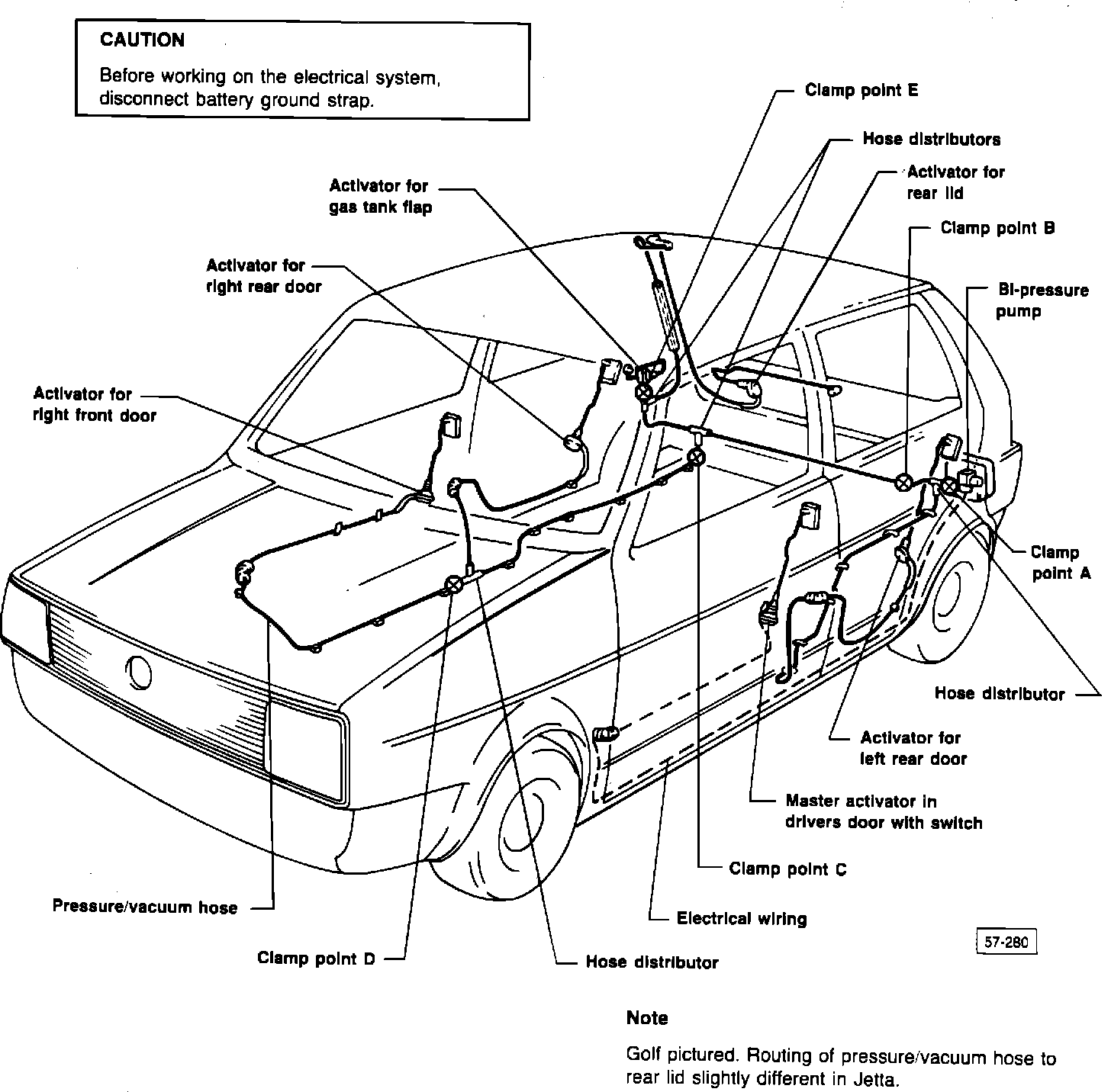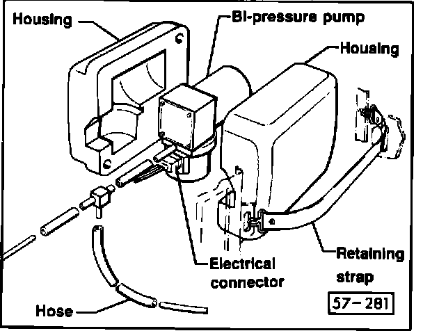The central locking system is operated pneumatically. The system uses a bi-pressure pump which supplies either pressure or vacuum to the left rear door, right side front and rear doors, rear lid and gas tank flap activators.