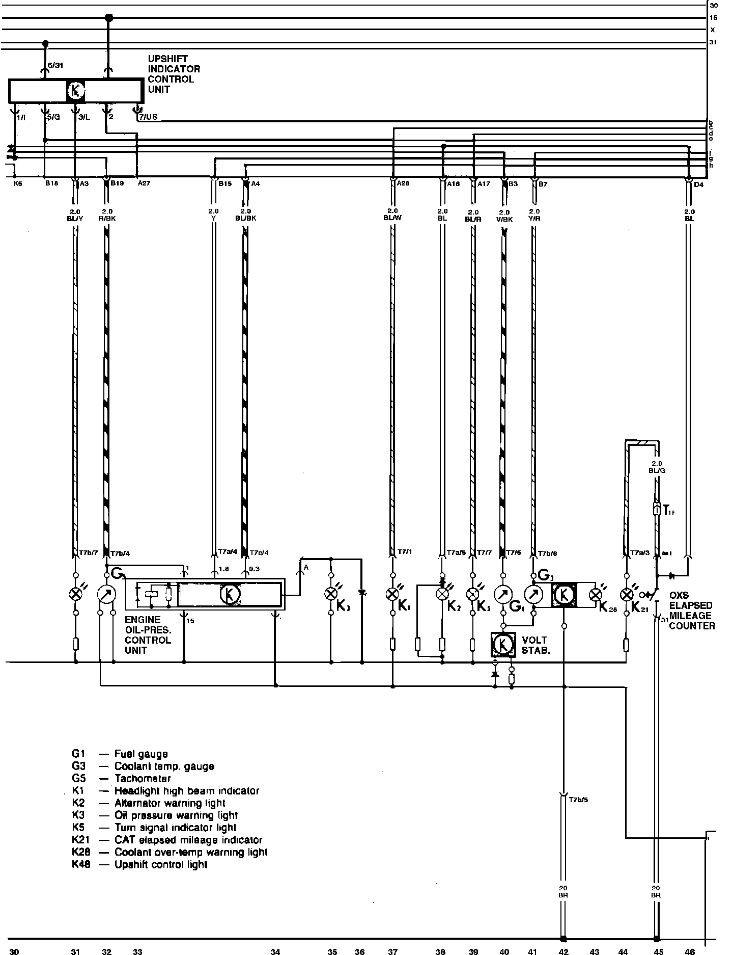 Fig. 35c Alternator, Coolant Over Temperature, Oil Pressure Warning, Fuel Gauge, Headlight, Oil Pressure Control Unit & Upshift Indicator:
