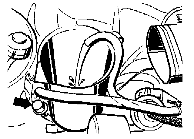 Fig. 4-8. Container being used to measure fuel delivery rate at return line (Digifant). Return line from fuel pressure regulator (lower right) is disconnected (arrow) near right (passenger side) front suspension strut tower.