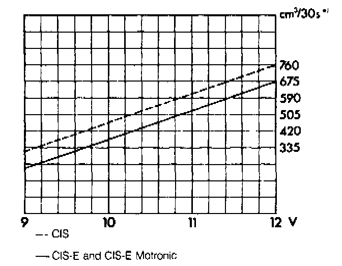 5. On models with CIS, CIS-E or CIS-E Motronic, the correct amount of fuel delivered depends on voltage at the pump while the pump is running. See the chart in Fig. 4-9 for exact specifications.