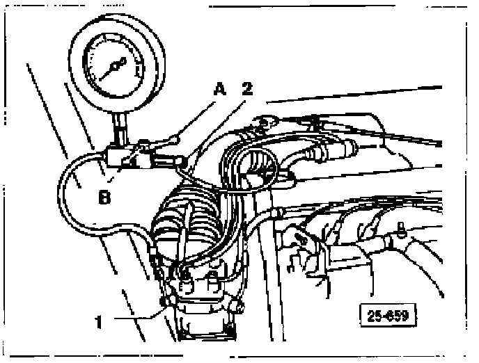 1. Fuel pressure gauge and valve (VW 1318/5) installed between fuel distributor test port (1) and cold-start valve supply line (2, removed from cold-start valve). Gauge valve is open in position and closed in position B.