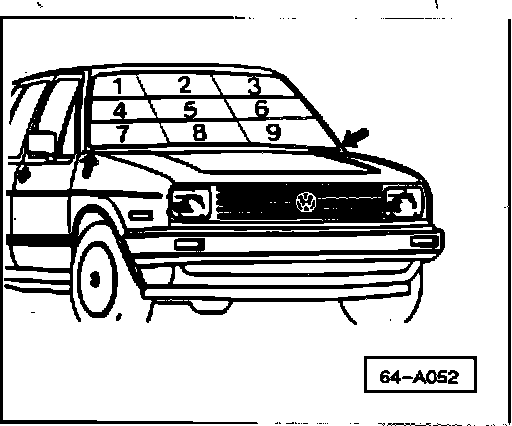 The windshield illustration indicates the most probable areas of windshield to body contact (arrows). In the event there is contact, photograph the area and submit it with an EPOS report describing the location of the contact by using the windshield area numbers shown in the illustration.