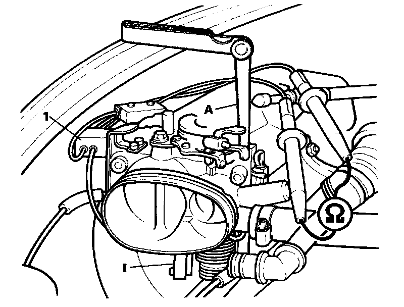 Multimeter reads (OL on US 1119), then push slowly in direction of full throttle stop (arrow) until full throttle switch closes and multimeter returns to 0 ohms.