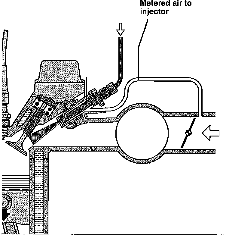 The injectors also incorporate "Air Shrouding" Fig. 15. In this system, a measured amount of metered air is allowed to flow around the injector (primarily during high vacuum conditions) to greatly improve atomization at low airflow speeds.