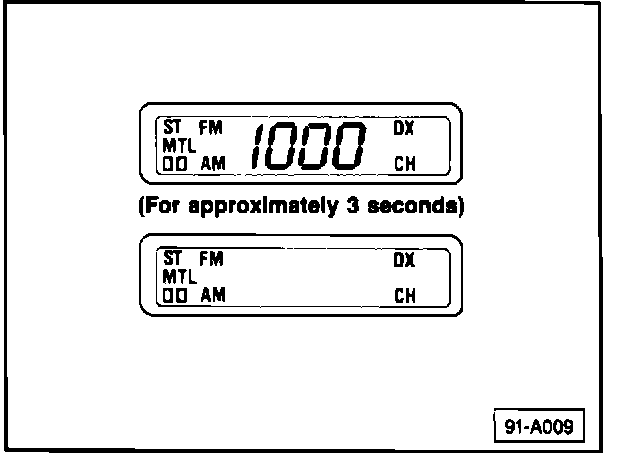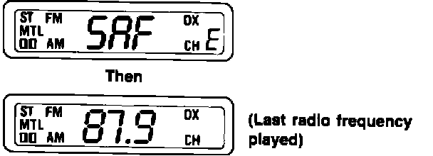 - push and hold AM/FM selector button down and then push and hold SCAN button until the display changes as shown below