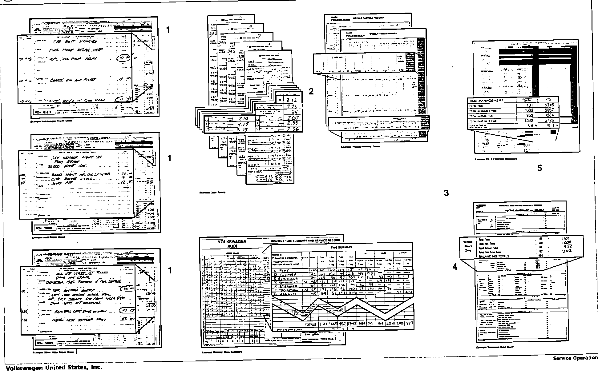 The Monthly Time Summary and Workshop Distribution forms have been changed to accommodate two new labor sales accounts for 1987. These accounts are 4413 mechanical labor sales warranty (Audi only) and 4415 mechanical labor sales internal (Audi only). Accounts 4403 and 4405 will now be used to report warranty and internal sales for Volkswagen only.
