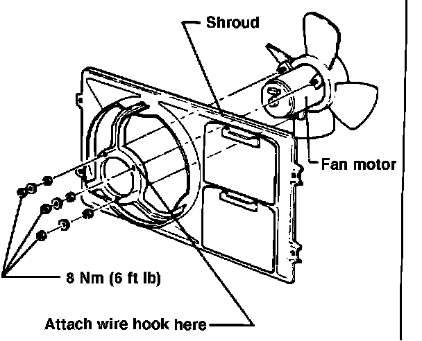 - attach remaining wire hook to radiator fan mounting bolt on fan shroud (Fig. 4)