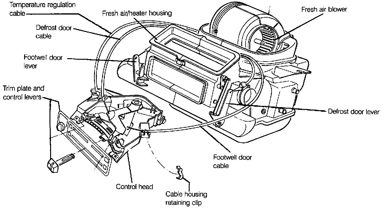 2. Slide the bottom temperature regulation lever fully to the left. Place the fresh air heater housing doors in their fully closed positions and connect the cables to the door levers and the control head.