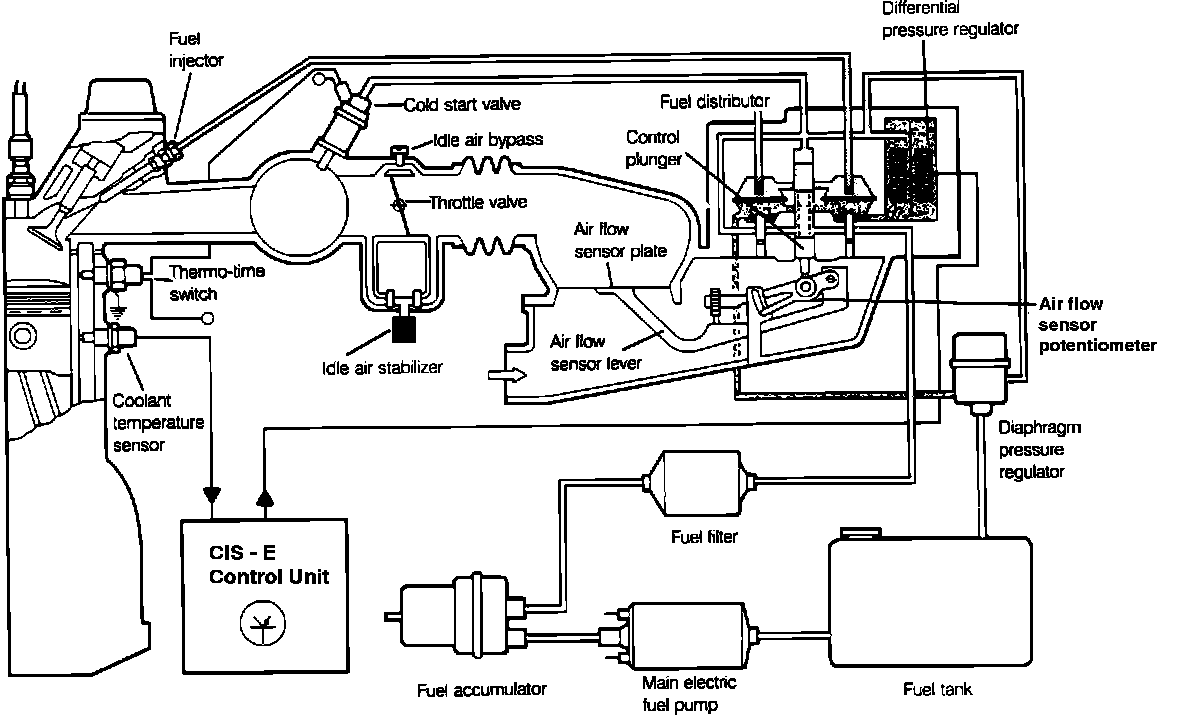 The CIS - E Computerized Engine Control system consists of the basic CIS fuel injection system (Continuous Injection) and electronic controls which are added for more precise control of the air/fuel mixture.