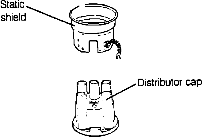 The distributor cap, clipped to the top of the distributor, is used to make the connection between the coil wire and the correct spark plug wire. The static shield provides radio static suppression so the high energy sparking that occurs inside the cap does not interfere with radio transmission/reception.