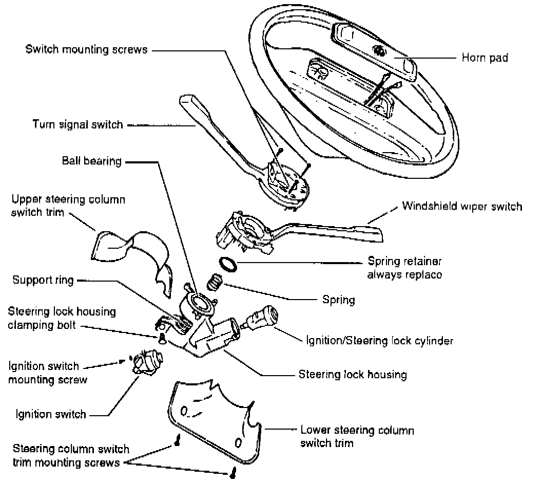 This is an exploded view of the steering wheel, steering lock housing and steering column switches. The turn signal and wiper/washer switches mount to the ignition/steering lock housing with three screws. The switches can be replaced individually if necessary, but individual pants for repair are not available.