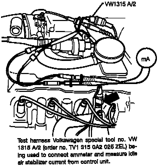 The idle air stabilizer valve operates continuously when the ignition is on and the coolant temperature sensor is connected. To check that the valve is functioning, start the engine. The valve should vibrate and hum slightly. If the valve is not operating, check that the idle switch on the throttle valve is closed and functioning correctly as described below. If no faults are found with the idle switch, turn the engine off, disconnect the harness connector from the valve, and check for continuity at the terminals on the valve. If there is no continuity, the valve is faulty and should be replaced.To check the idle stabilization function of the control unit, measure the current flow to the valve.The image shows a special wire harness used to hook up an ammeter (0 to 1000 mA range). Alernately, a harness can be fabricated to allow hookup of an ammeter as shown.