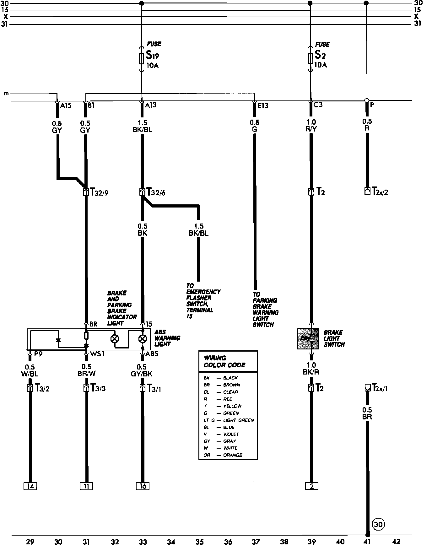 T1 - single, above fuse/relay panel T1a - single, behind fuse/relay panel T2 - double, behind dashboard T2a - double, on ABS hydraulic unit T2b - double, on ABS hydraulic unit T2c - double, under rear seat, right side T2d - double, in engine compartment, near right strut T2e - double, under rear seat, left side T2f - double, in engine compartment, near left strut T2g - double, on ABS brake fluid level warning switch T2h - double, on brake fluid level warning switch T2x - double, behind fuse/relay panel T2y - double, in shift console T3 - three-point, behind dashboard T5 - five-point, on ABS hydraulic unit T7 - seven-point, on ABS hydraulic unit T32 - thirty-two point, behind fuse/relay panel