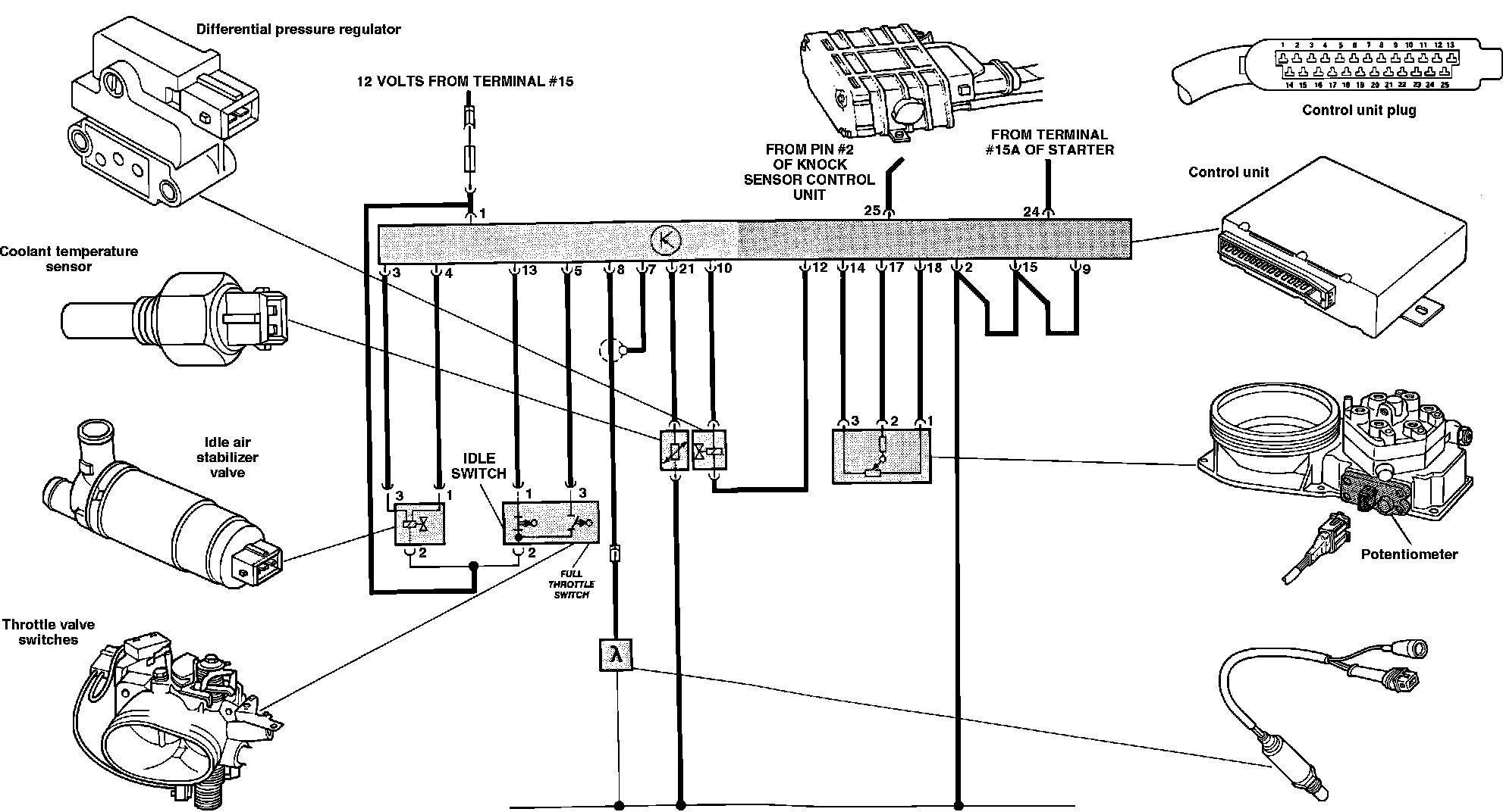 The CIS-E control unit, which is located in the cowl at the left rear of the engine compartment, receives and evaluates information provided by various sensors concerning engine operating conditions. From the information received, the control unit calculates the appropriate output values for the differential pressure regulator, and the idle stabilizer valve which are needed to maintain optimum engine performance and emission characteristics. Input signals include:
