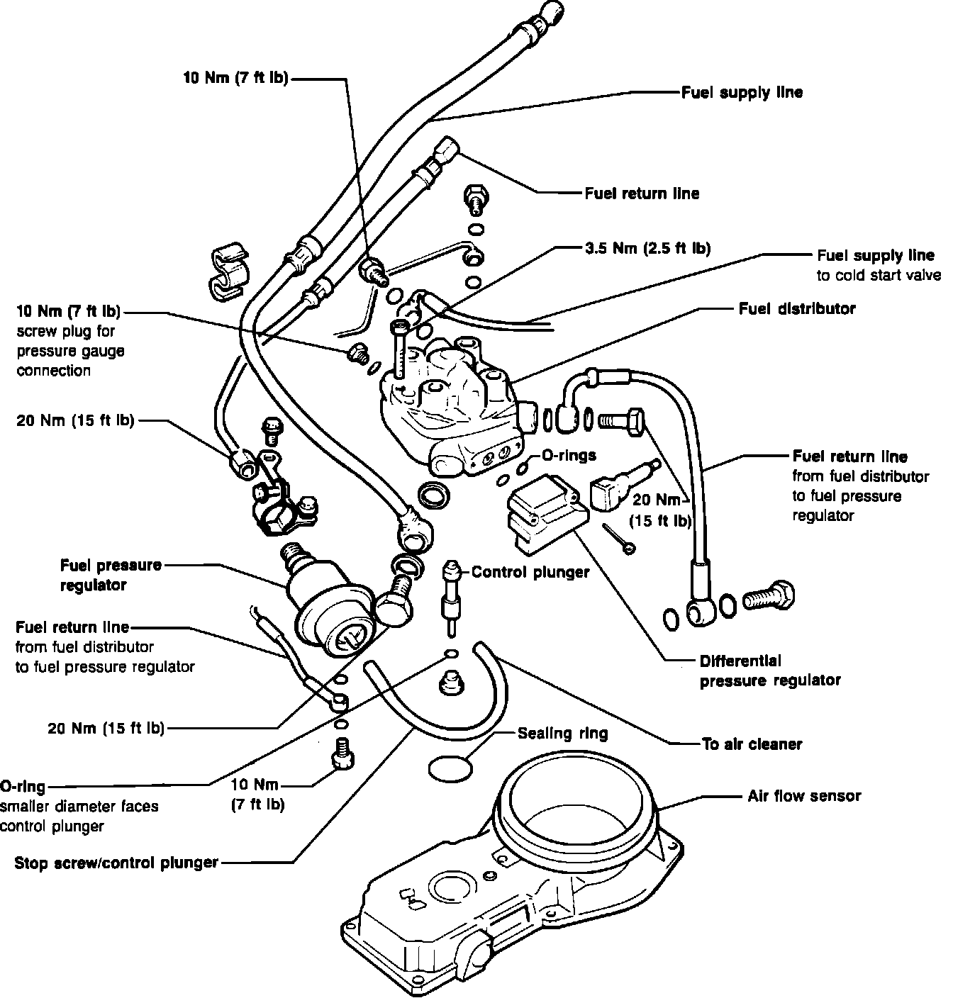 CAUTION: Absolute cleanliness is essential when working with fuel circuit components of CIS-E. Even a minute particle of dirt can cause major trouble if it reaches the fuel distributor or fuel injectors. Before disconnecting any of the fuel line connections, throughly clean the unions. Always use clean tools.