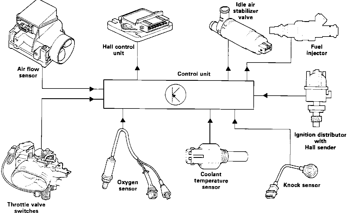 From the information received, the Digifant II control unit calculates appropriate values for the output components, which maintain optimum engine performance and emission characteristics. Output signals from the Digifant II control unit include: