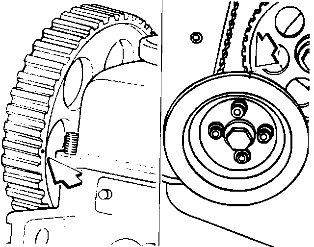 a. The mark in the camshaft pulley must line up with the cylinder head to valve cover mating surface.