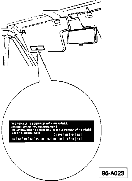 ^ airbag system must be replaced 10 years after date of manufacture. Replacement year and month are stamped in sun visor. If sun visor is replaced for any reason, information must be transferred to new sun visor