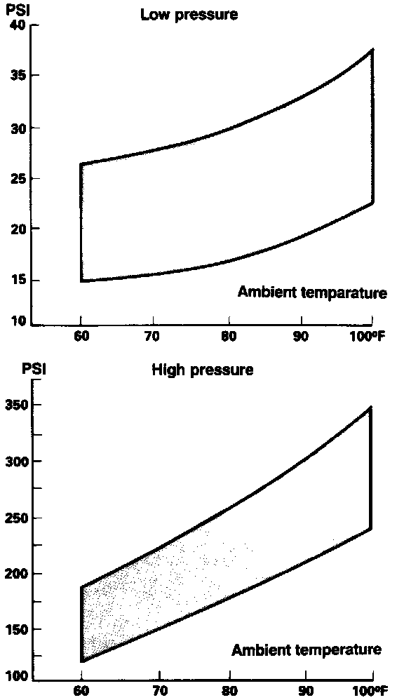 charge and servicing the system. The system pressures should be in the blocked areas according to the ambient air temperatures.