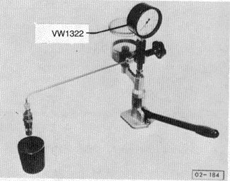 Fig. 1. Injector installed on hand pressure pump. Volkswagen special tool (VW1322 or US1111) shown.