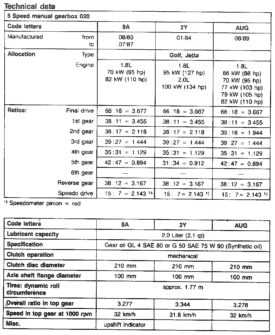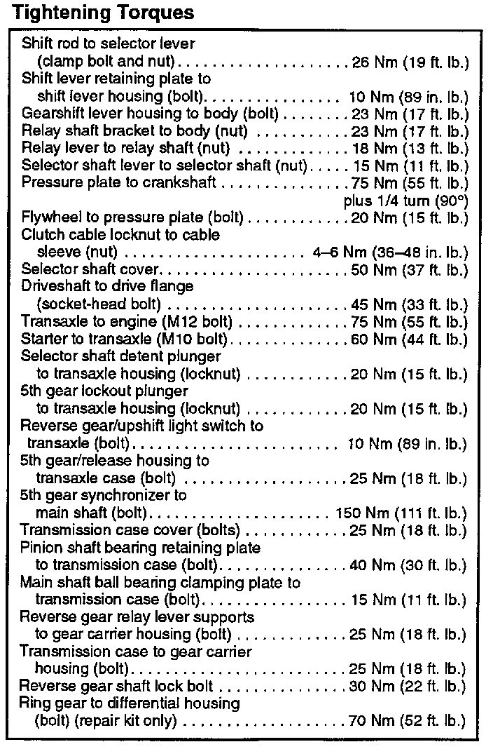 Torque Specifications5 Speed Manual Transmission Gearbox Specifications (020):