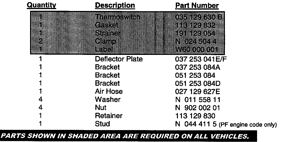 PARTS SHOWN IN SHADED AREA ARE REQUIRED ON ALL VEHICLES.