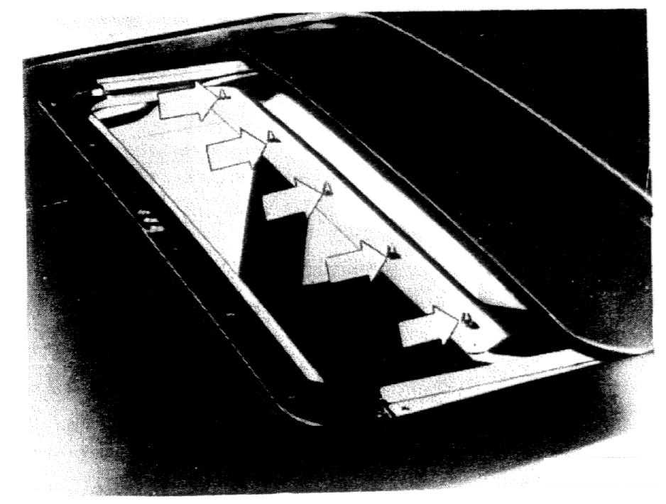 1. Open the sunroof halfway. Use a wooden or plastic wedge to pry the front edge of the trim panel from the sunroof. Pry as close as possible to each of the five clips (arrows) that hold trim panel to sunroof. Remove the clips and push the panel back into the roof.