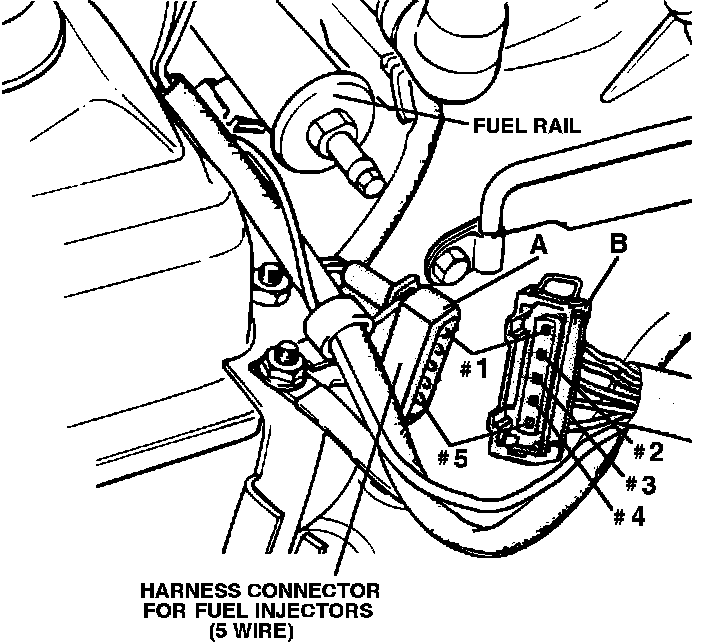 1. Using a suitable digital multimeter, set to measure resistance (ohms), check resistance between terminals #1 and #5 of the fuel rail mounted connector (A). Fuel injector resistance should be: