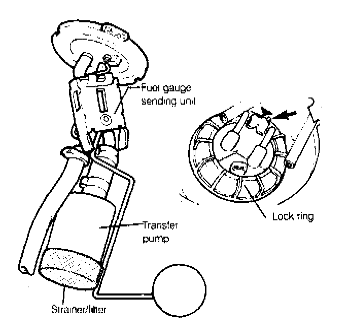 4. Loosen and remove the large lock ring on the transfer pump and fuel gauge sending unit assembly by turning it counterclockwise. See Fig. 4-5. Remove the assembly from the fuel tank.