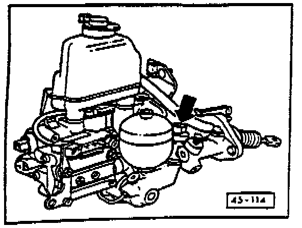 ^ remove pressure warning switch (1), Part No. 191 927 821, located in hydraulic modulator (master cylinder) (2) and discard