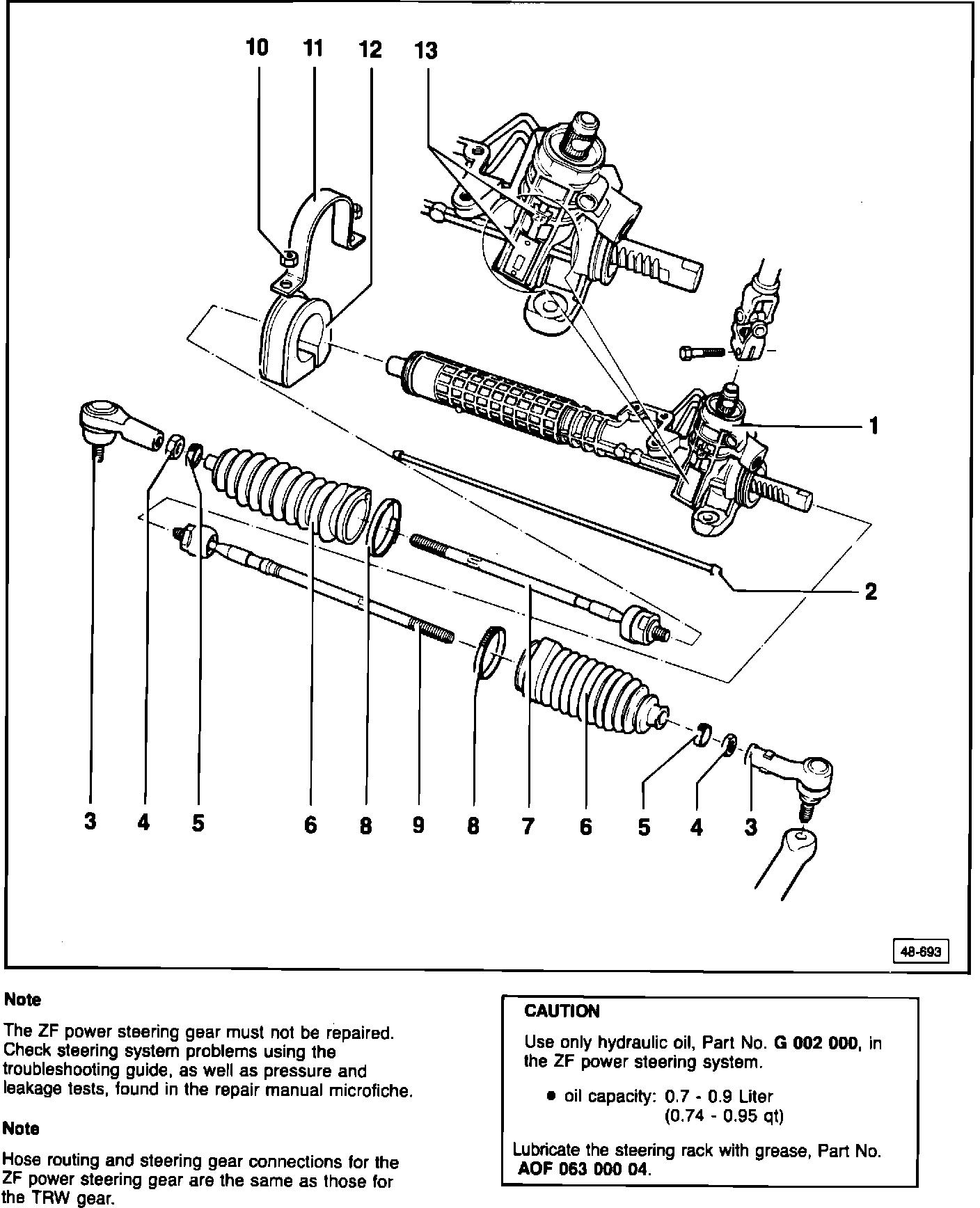 ALL components of the ZF power steering gear are different from those on the TRW power steering gear. Ensure that parts are not interchanged between the two types of steering gear. This includes tie rods, boots and clamps.
