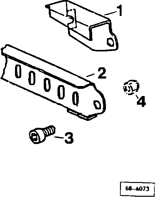 ^ locate original seat track stop plate (1), on lower seat frame center rail (2), and remove 6 mm securing bolt (3), and nut (4)