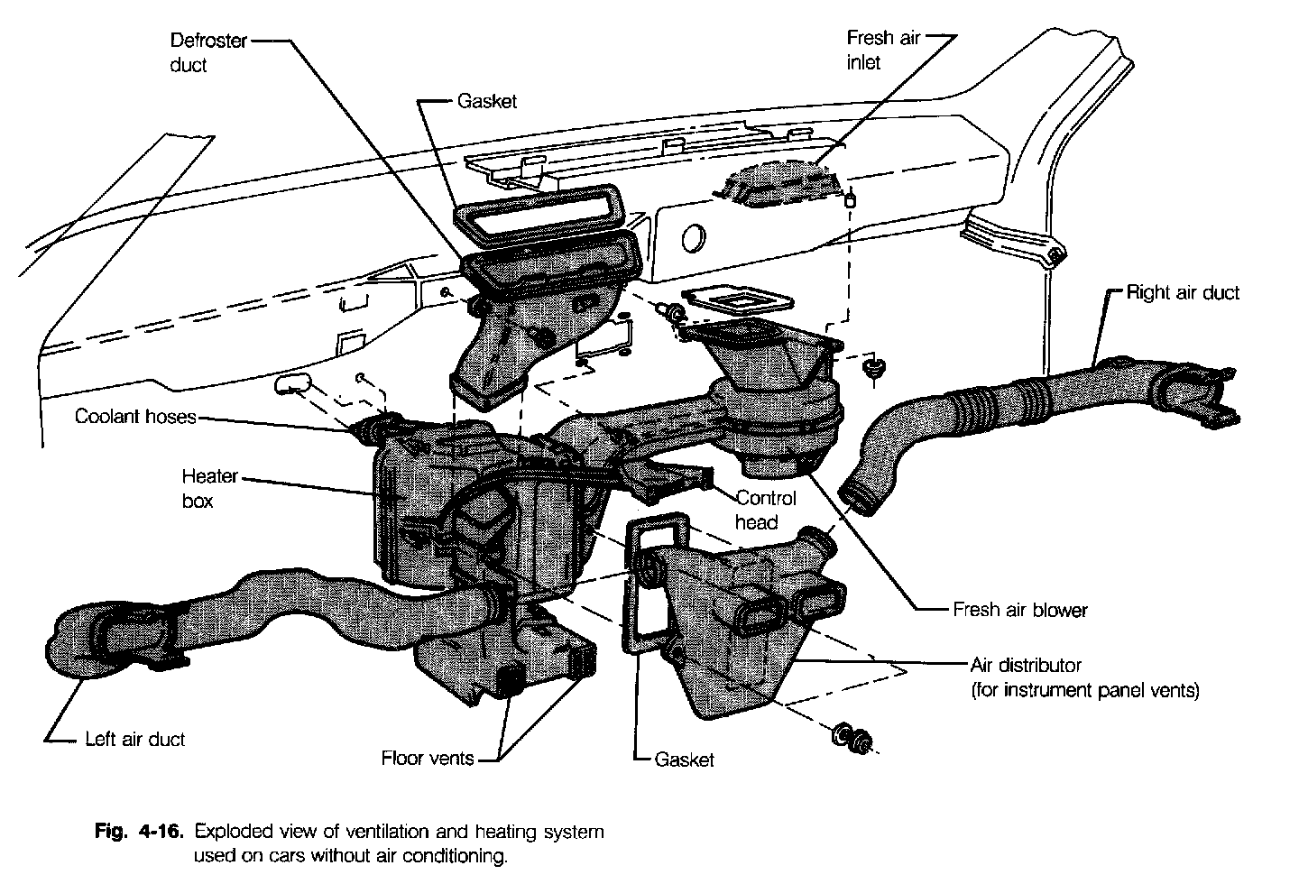 On 1985-1987 models, it is not necessary to remove the instrument panel. Instead, remove only the center console, the vent and defroster ducts, and the heater control head.