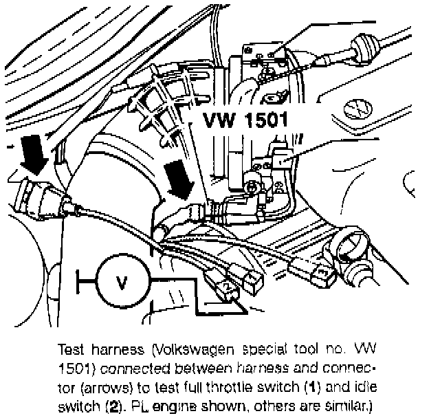 Each switch opens or closes the circuit depending on throttle position. The switch functions are checked by making continuity checks with an ohmmeter at the switch connector. Image above shows Volkswagen special tool no. VW 1501 (order no. TV1 501 000 24 ZEL) attached to the throttle switch connector in place of the normal wiring harness connector on a ClS-E engine. The test harness provides convenient test points, but the switches can be tested without it.