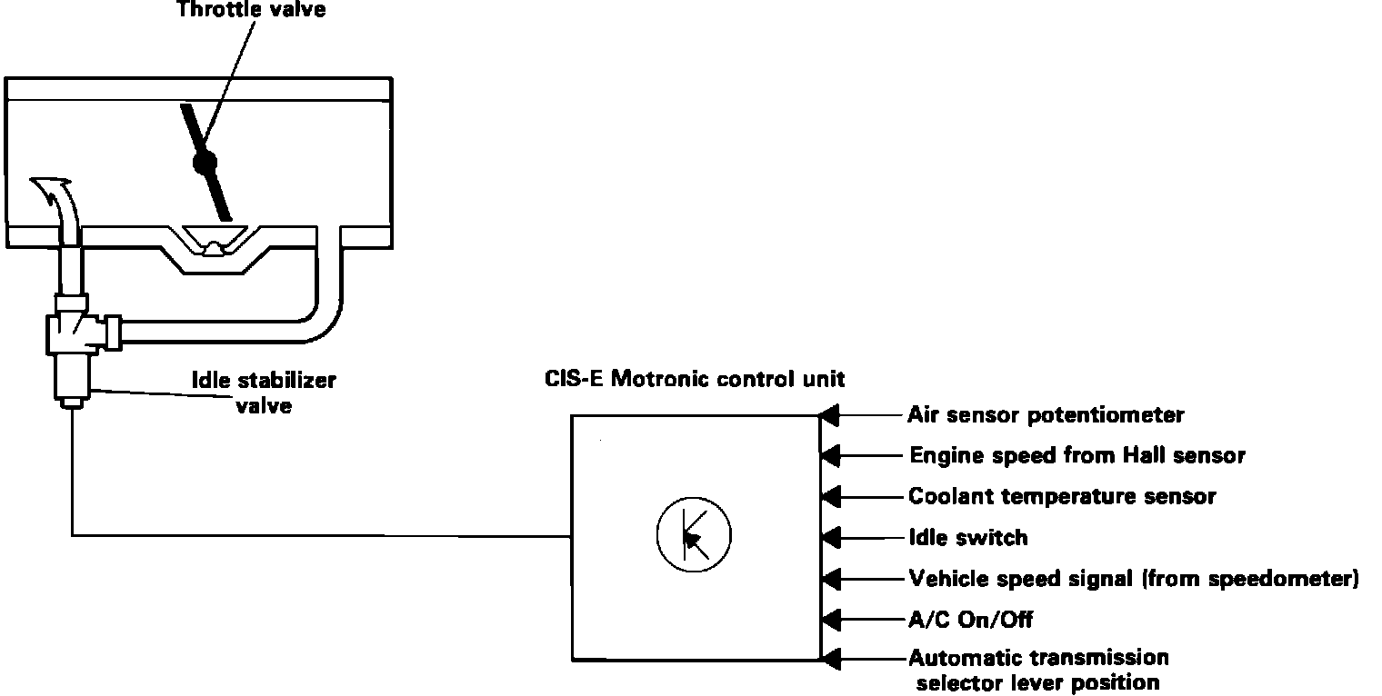 The CIS-E Motronic control unit compares the actual engine speed with programmed speeds for various conditions (A/C on, A/T selector lever in Drive, etc.).